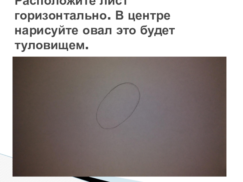 Слайд 2Расположите лист горизонтально. В центре нарисуйте овал это будет туловищем.