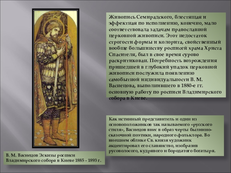 Как истинный представитель и один из основоположников так называемого «русского стиля», Васнецов внес в образ черты былинно-сказочной поэтики, народного фольклора. Во внешнем облике Св. князя художник акцентировал его славянство, изобразив русоволосого, кудрявого и бородатого богатыря.