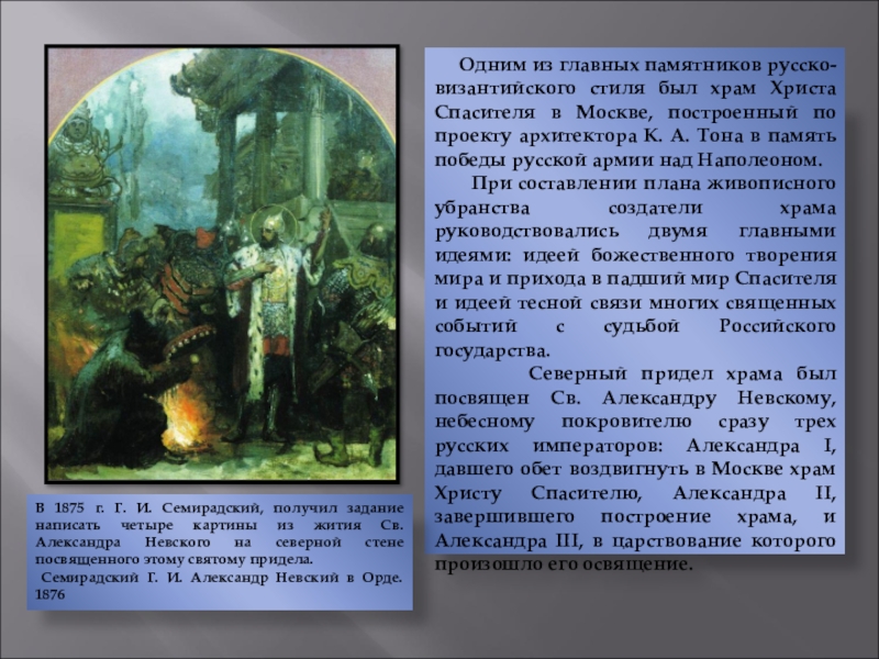 В 1875 г. Г. И. Семирадский, получил задание написать четыре картины из жития Св. Александра Невского на северной стене посвященного этому святому придела.