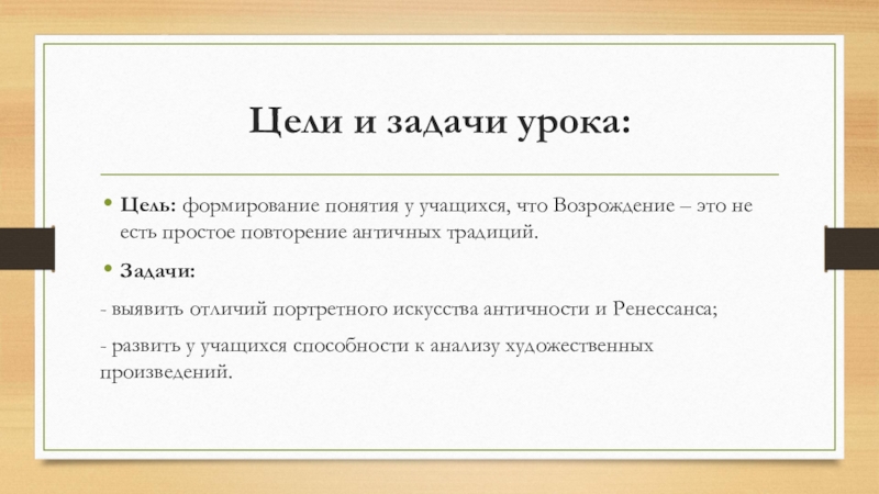 Цели и задачи урока:Цель: формирование понятия у учащихся, что Возрождение – это не есть простое повторение античных традиций.Задачи:- выявить отличий портретного искусства античности и Ренессанса;- развить у учащихся способности к анализу художественных произведений.