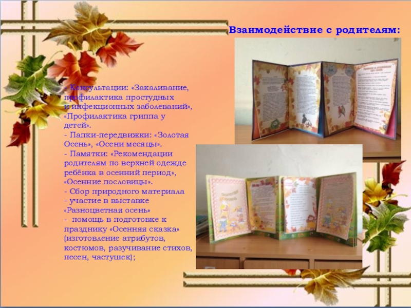 - Памятки: «Рекомендации родителям по верхней одежде ребёнка в осенний период», «Осенние пословицы».