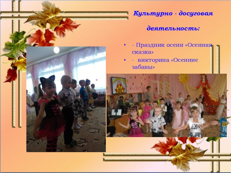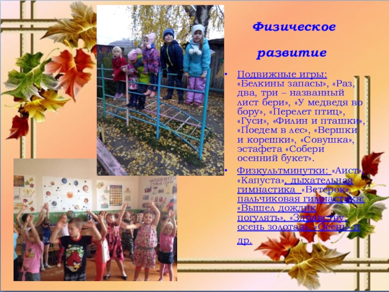 лист бери», «У медведя во бору», «Перелет птиц», «Гуси», «Филин и пташки», «Поедем в лес», «Вершки и корешки», «Совушка», эстафета «Собери осенний букет».