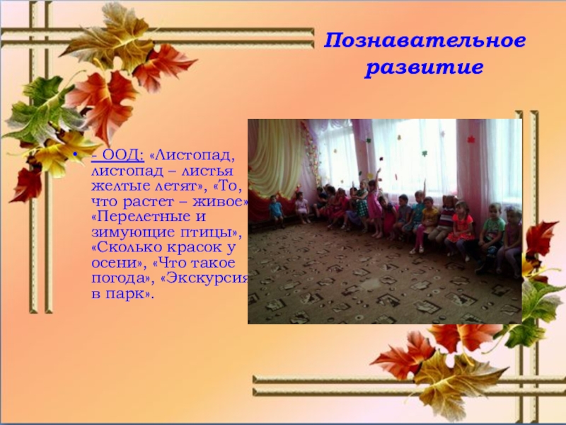 - ООД: «Листопад, листопад – листья желтые летят», «То, что