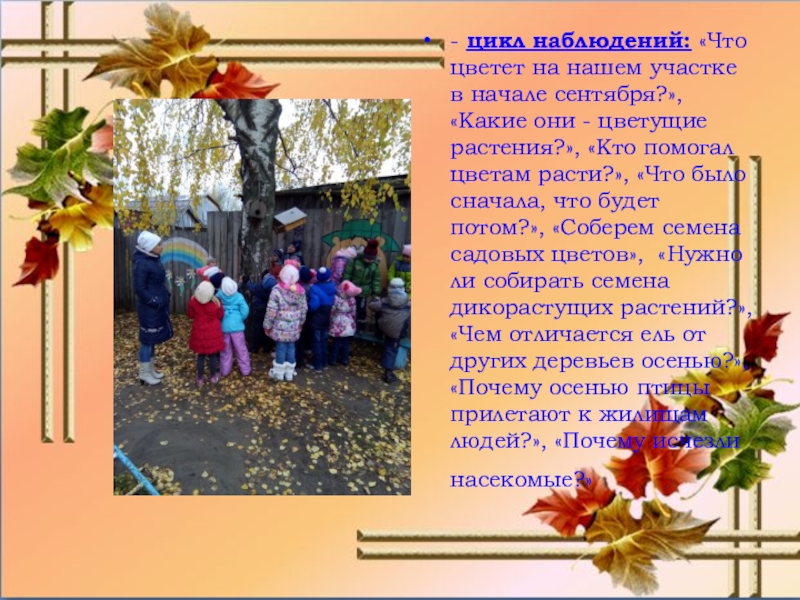 Слайд 16- цикл наблюдений: «Что цветет на нашем участке в начале сентября?»,
