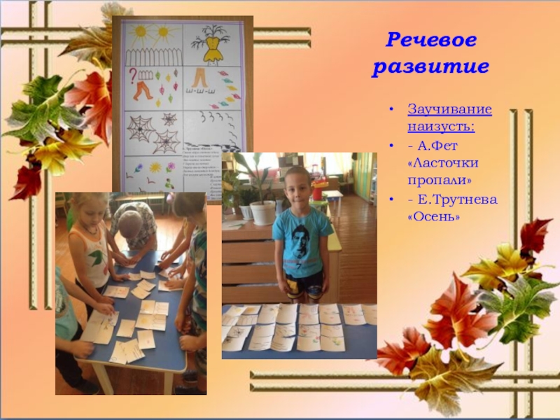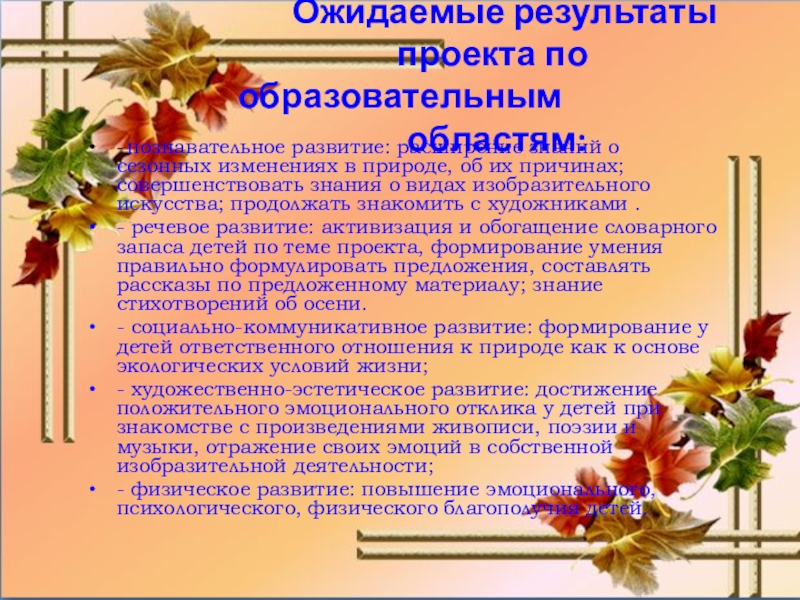 - речевое развитие: активизация и обогащение словарного запаса детей по теме проекта, формирование умения правильно формулировать предложения, составлять рассказы по предложенному материалу; знание стихотворений об осени.