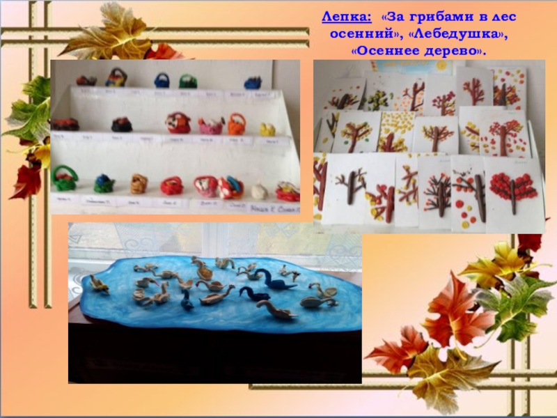 Слайд 30Лепка: «За грибами в лес осенний», «Лебедушка», «Осеннее дерево».