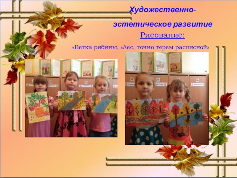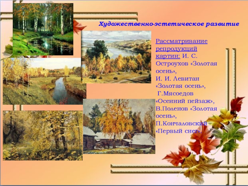 - познавательное развитие: расширение знаний о сезонных изменениях в природе, об их причинах; совершенствовать знания о видах изобразительного искусства; продолжать знакомить с художниками .