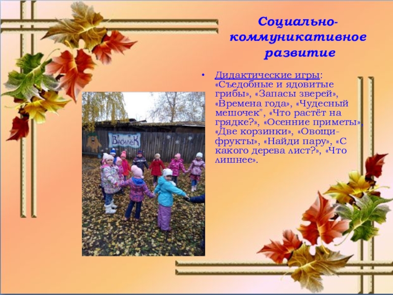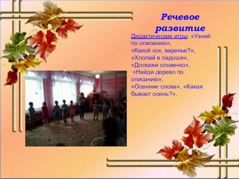 «Чудесный мешочек", «Что растёт на грядке?», «Осенние приметы», «Две корзинки», «Овощи-фрукты», «Найди пару», «С какого дерева лист?», «Что лишнее».
