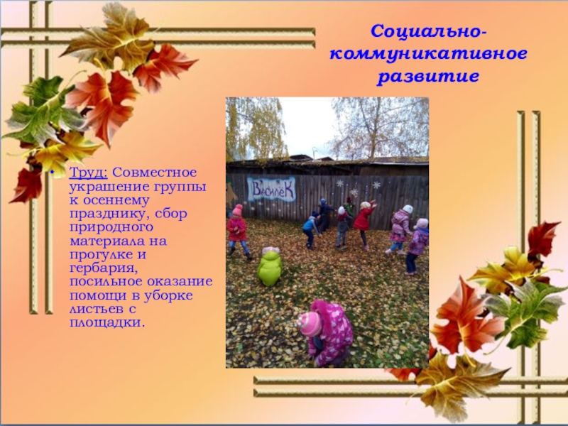 Труд: Совместное украшение группы к осеннему празднику, сбор природного материала