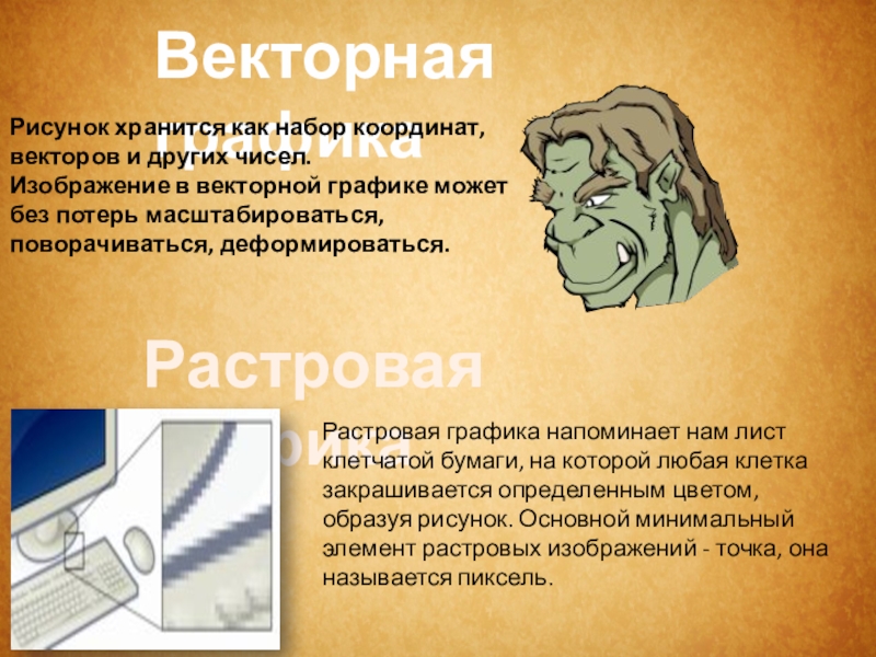 Растровая графика напоминает нам лист клетчатой бумаги, на которой любая клетка закрашивается определенным цветом, образуя рисунок. Основной минимальный элемент растровых изображений - точка, она называется пиксель.
