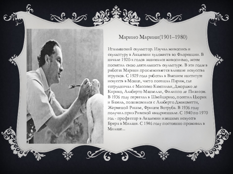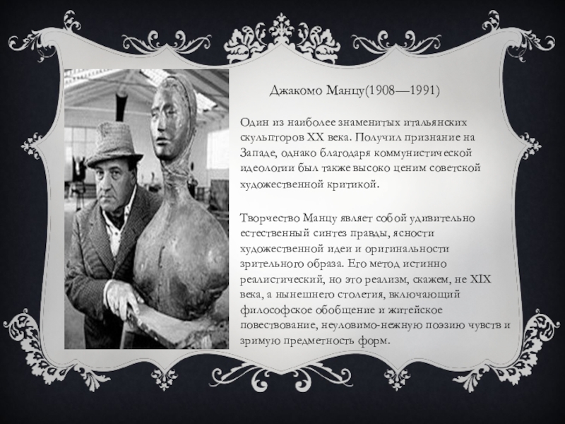 Один из наиболее знаменитых итальянских скульпторов XX века. Получил признание