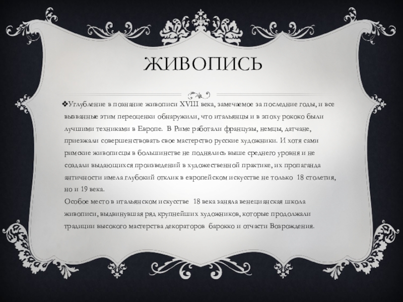 Особое место в итальянском искусстве 18 века заняла венецианская школа живописи, выдвинувшая ряд крупнейших художников, которые продолжали традиции высокого мастерства декораторов барокко и отчасти Возрождения.