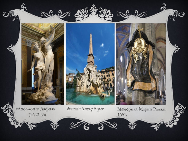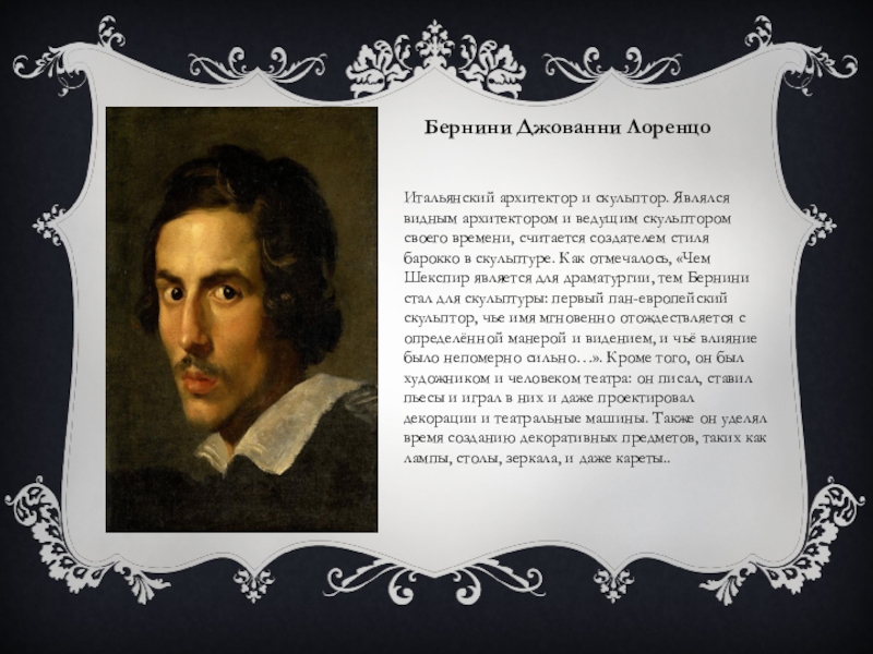 скульптором своего времени, считается создателем стиля барокко в скульптуре. Как отмечалось, «Чем Шекспир является для драматургии, тем Бернини стал для скульптуры: первый пан-европейский скульптор, чье имя мгновенно отождествляется с определённой манерой и видением, и чьё влияние было непомерно сильно…». Кроме того, он был художником и человеком театра: он писал, ставил пьесы и играл в них и даже проектировал декорации и театральные машины. Также он уделял время созданию декоративных предметов, таких как лампы, столы, зеркала, и даже кареты..