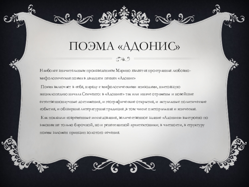 Наиболее значительным произведением Марино является пространная любовно-мифологическая поэма в двадцати
