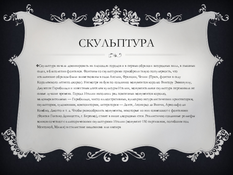 загородных вилл, в пышных садах, в благолепии фонтанов. Фонтаны со скульптурами приобрели такую популярность, что итальянские образцы были заимствованы в сады Англии, Франции, Чехии (Прага, фонтан в саду Королевского летнего дворца). Несмотря на бум по созданию монументов королю Виктору Эммануилу, Джузеппе Гарибальди и известным деятелям культуры Италии, монументальная скульптура переживала не самые лучшие времена. Города Италии наполнил ряд помпезных монументов королю, маловыразительных — Гарибальди, чисто иллюстративных, вульгарно натуралистических архитекторам, скульпторам, художникам, композиторам, литераторам — Данте, Леонардо да Винчи, Арнольфо ди Камбио, Джотто и т. д. Чтобы разнообразить монументы, некоторые из них совмещают с фонтанами (Фонтан Гаэтано Доницетти, г. Бергамо), ставят в нише дворцовых стен. Реалистично созданные рельефы воинов сочетают с аллегорическими скульптурами Италии (монумент 150 партизанам, погибшим под Ментоной, Милан) в стилистике академизма или ампира