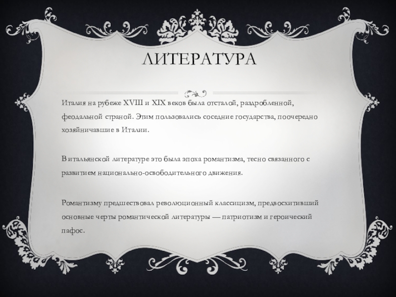 В итальянской литературе это была эпоха романтизма, тесно связанного с развитием национально-освободительного движения.