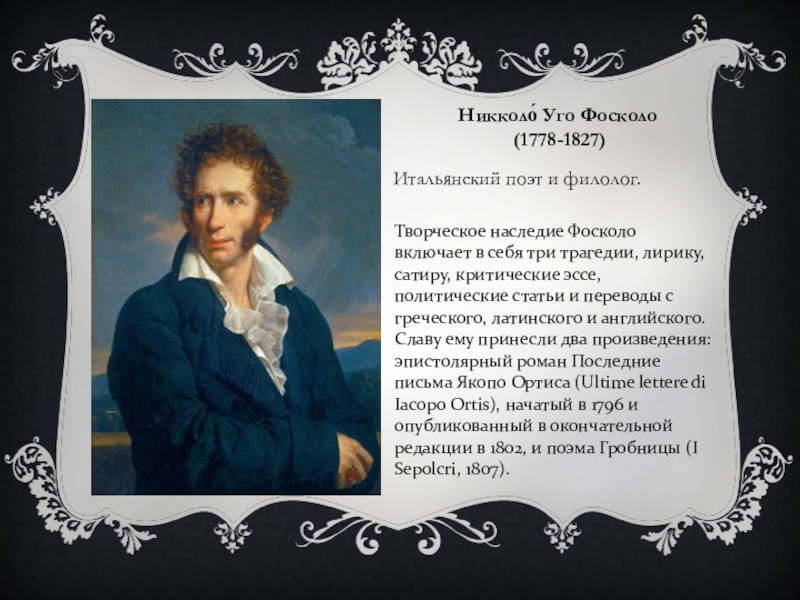 себя три трагедии, лирику, сатиру, критические эссе, политические статьи и переводы с греческого, латинского и английского. Славу ему принесли два произведения: эпистолярный роман Последние письма Якопо Ортиса (Ultime lettere di Iacopo Ortis), начатый в 1796 и опубликованный в окончательной редакции в 1802, и поэма Гробницы (I Sepolcri, 1807).