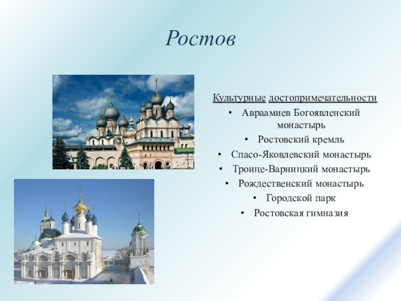 РостовКультурные достопримечательностиАвраамиев Богоявленский монастырьРостовский кремльСпасо-Яковлевский монастырьТроице-Варницкий монастырьРождественский монастырьГородской паркРостовская гимназия