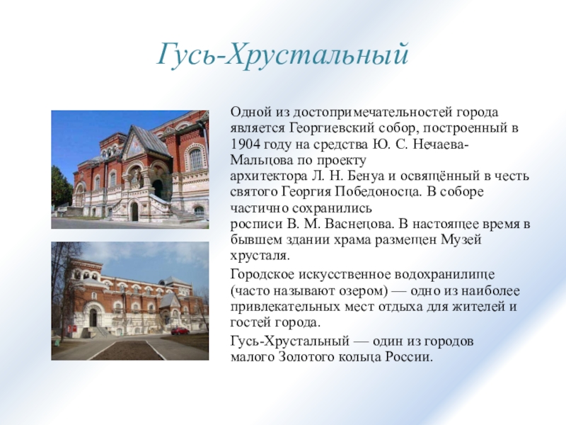 Гусь-ХрустальныйОдной из достопримечательностей города является Георгиевский собор, построенный в 1904 году на средства Ю. С. Нечаева-Мальцова по проекту архитектора Л. Н. Бенуа и освящённый в честь