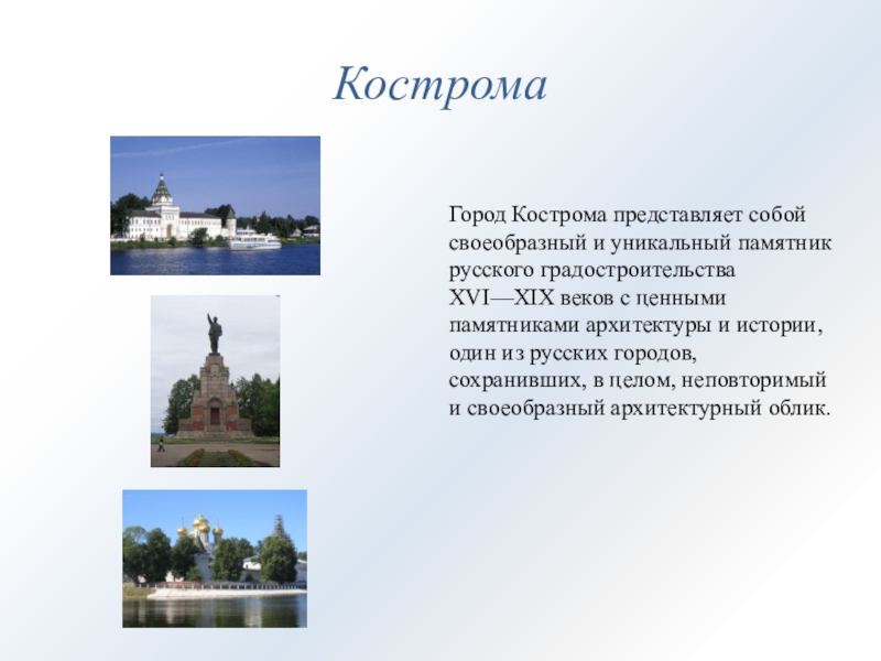 КостромаГород Кострома представляет собой своеобразный и уникальный памятник русского градостроительства XVI—XIX веков с ценными памятниками архитектуры и
