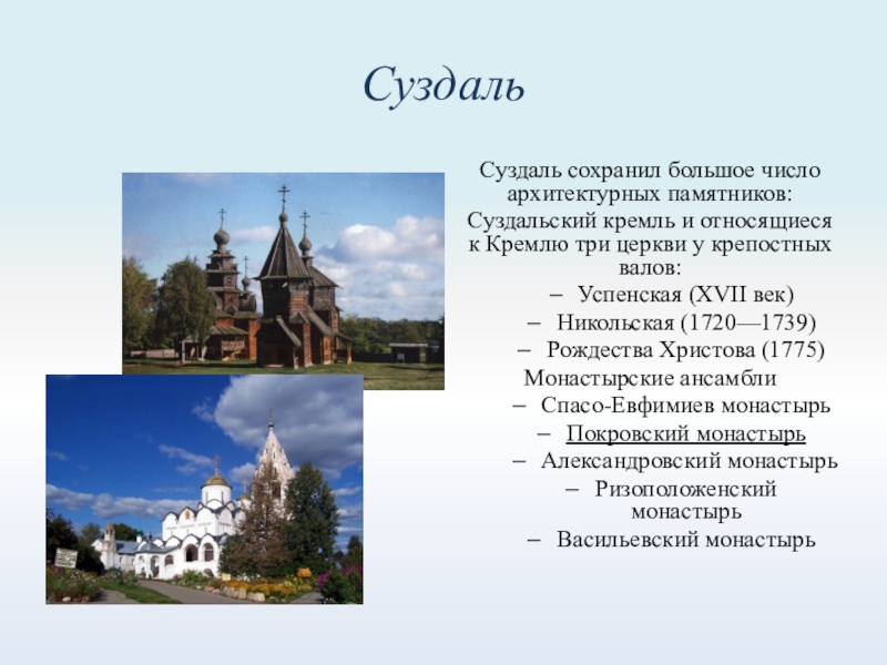 СуздальСуздаль сохранил большое число архитектурных памятников:Суздальский кремль и относящиеся к Кремлю три церкви у крепостных валов:Успенская (XVII век)Никольская (1720—1739)Рождества Христова (1775)Монастырские