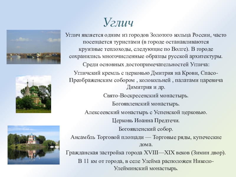 УгличУглич является одним из городов Золотого кольца России, часто посещается туристами (в городе останавливаются круизные теплоходы, следующие по Волге).