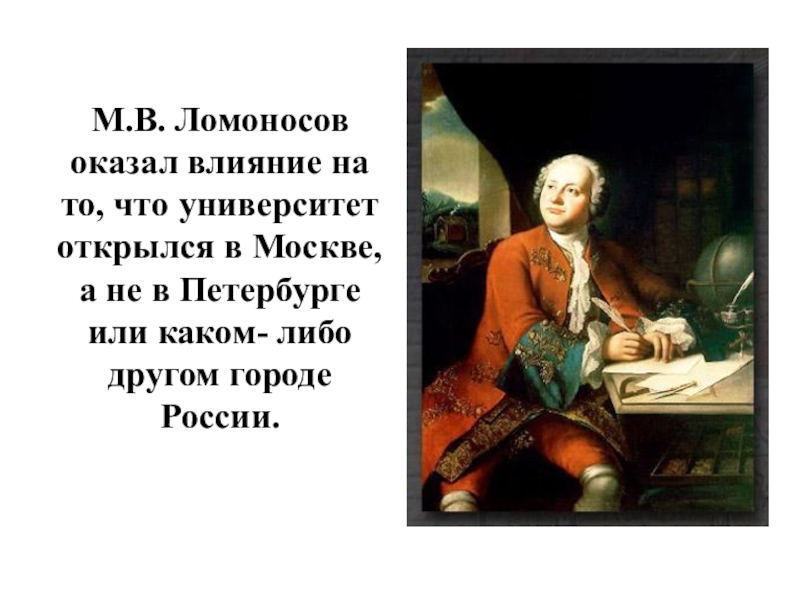 Слайд 16 М.В. Ломоносов оказал влияние на то, что университет открылся в Москве,