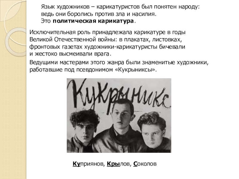 Ведущими мастерами этого жанра были знаменитые художники, работавшие под псевдонимом «Кукрыниксы».