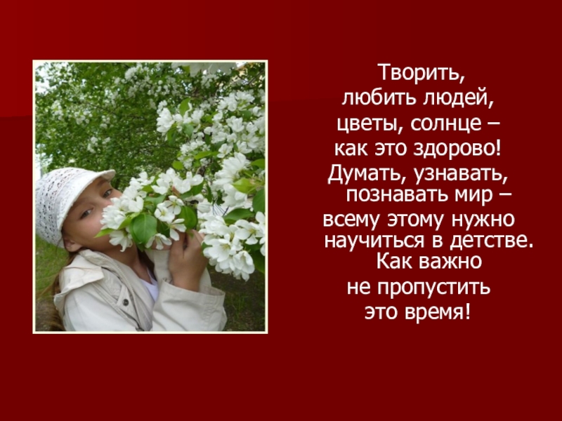 Творить, любить людей, цветы, солнце – как это здорово! Думать, узнавать, познавать мир – всему этому