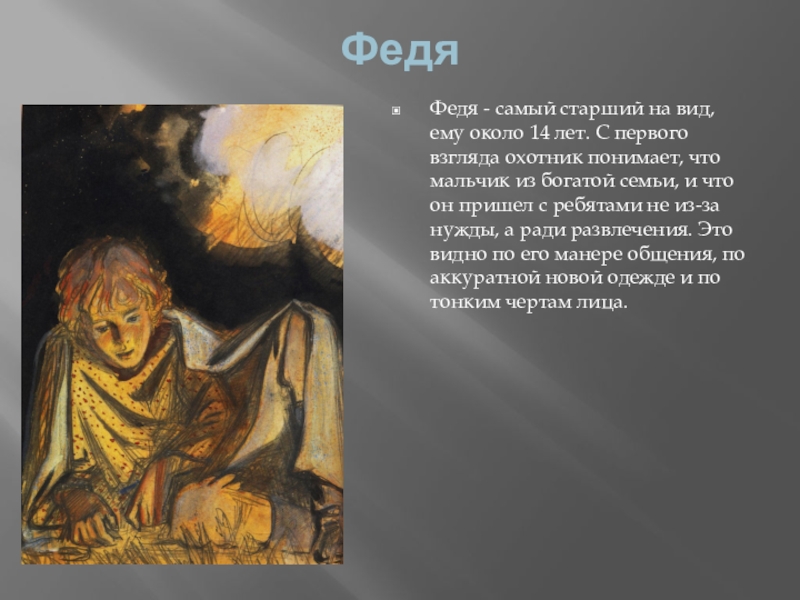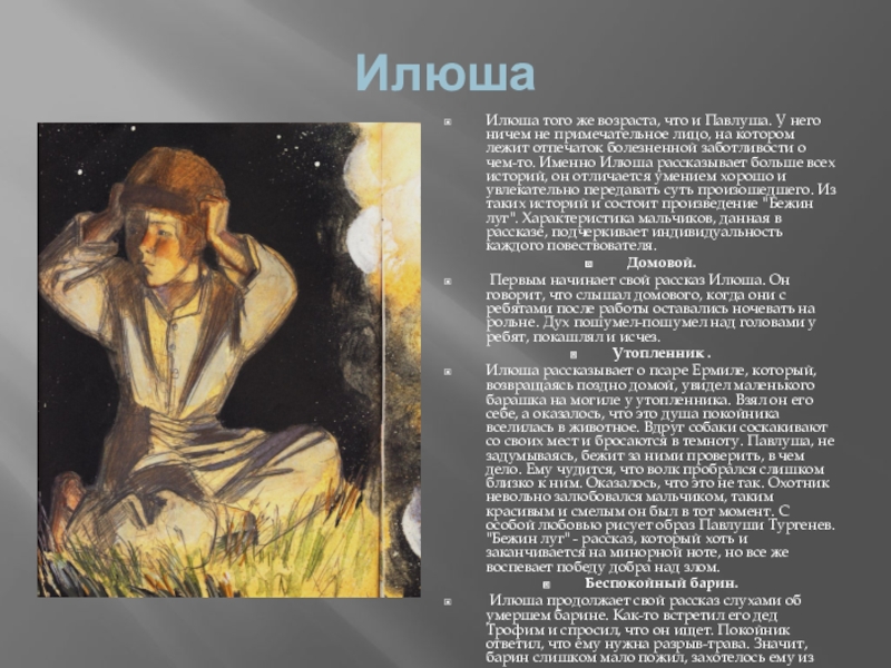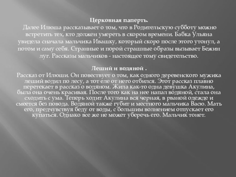 Рассказ от Илюши. Он повествует о том, как одного деревенского мужика леший водил по лесу, а тот еле от него отбился. Этот рассказ плавно перетекает в рассказ о водяном. Жила как-то одна девушка Акулина, была она очень красивая. После того как на нее напал водяной, стала она сходить с ума. Теперь ходит Акулина вся черная, в рваной одежде и смеется без повода. Водяной также губит и местного мальчика Васю. Мать его, предчувствуя беду от воды, с большим волнением отпускает его купаться. Однако все же не может уберечь его. Мальчик тонет.
