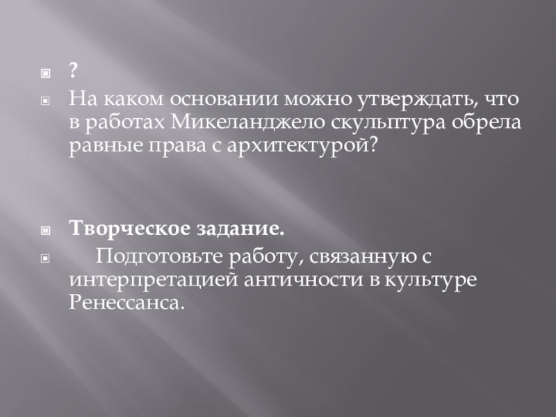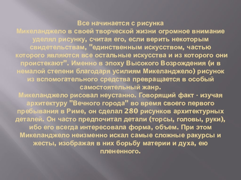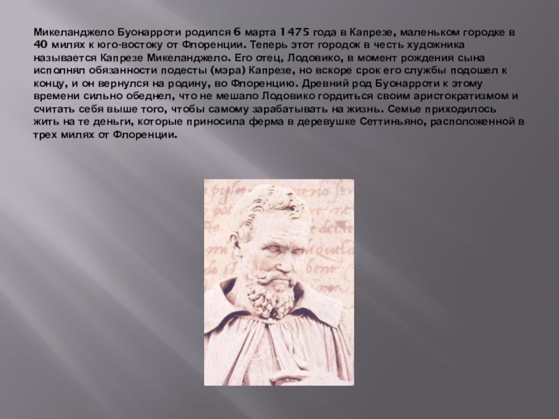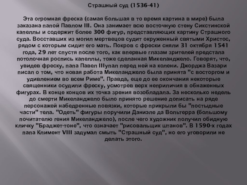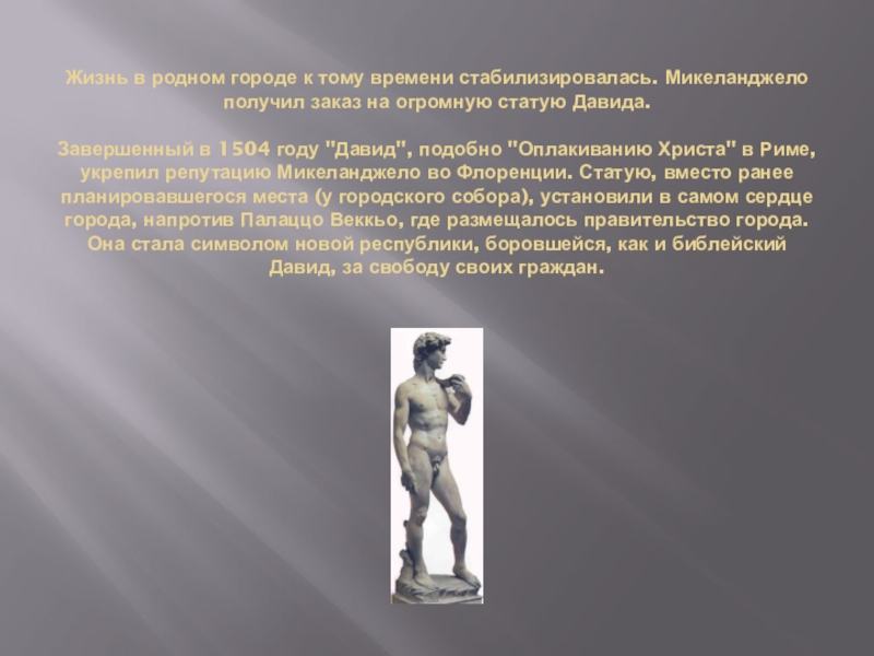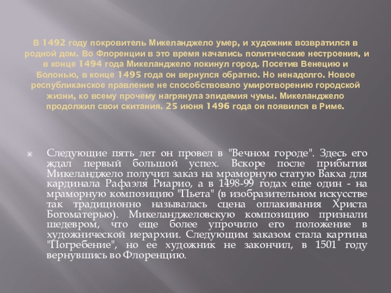 Следующие пять лет он провел в "Вечном городе". Здесь его ждал первый большой успех. Вскоре после прибытия Микеланджело получил заказ на мраморную статую Вакха для кардинала Рафаэля Риарио, а в 1498-99 годах еще один - на мраморную композицию "Пьета" (в изобразительном искусстве так традиционно называлась сцена оплакивания Христа Богоматерью). Микеланджеловскую композицию признали шедевром, что еще более упрочило его положение в художнической иерархии. Следующим заказом стала картина "Погребение", но ее художник не закончил, в 1501 году вернувшись во Флоренцию.