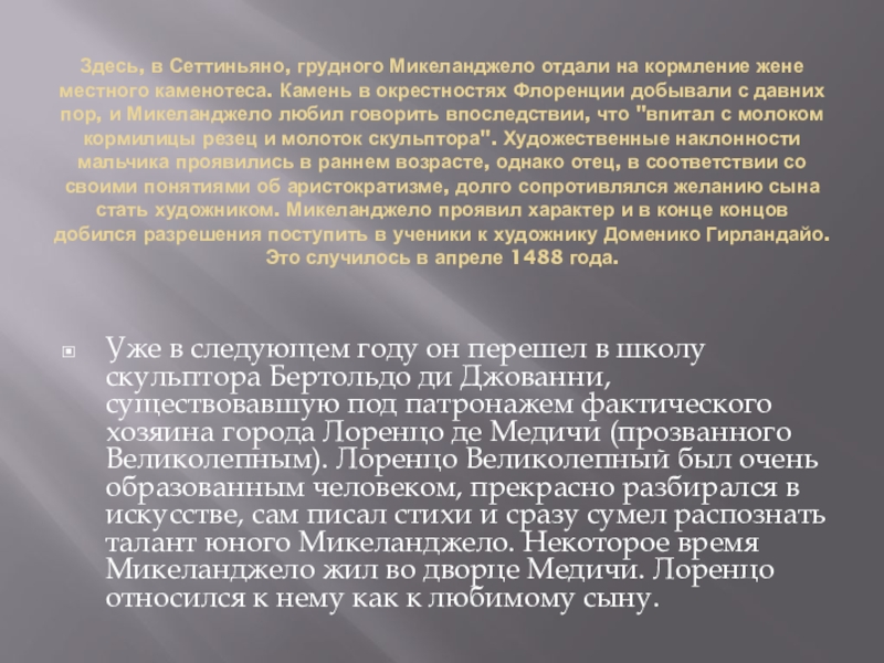 Уже в следующем году он перешел в школу скульптора Бертольдо ди Джованни, существовавшую под патронажем фактического хозяина города Лоренцо де Медичи (прозванного Великолепным). Лоренцо Великолепный был очень образованным человеком, прекрасно разбирался в искусстве, сам писал стихи и сразу сумел распознать талант юного Микеланджело. Некоторое время Микеланджело жил во дворце Медичи. Лоренцо относился к нему как к любимому сыну.