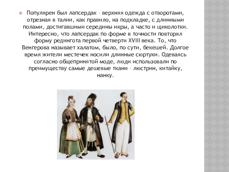 Слайд 8Популярен был лапсердак – верхняя одежда с отворотами, отрезная в талии,