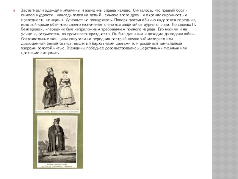 Слайд 10Застегивали одежду и мужчины и женщины справа налево. Считалось, что правый