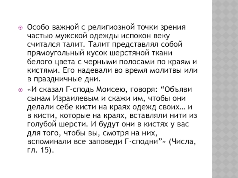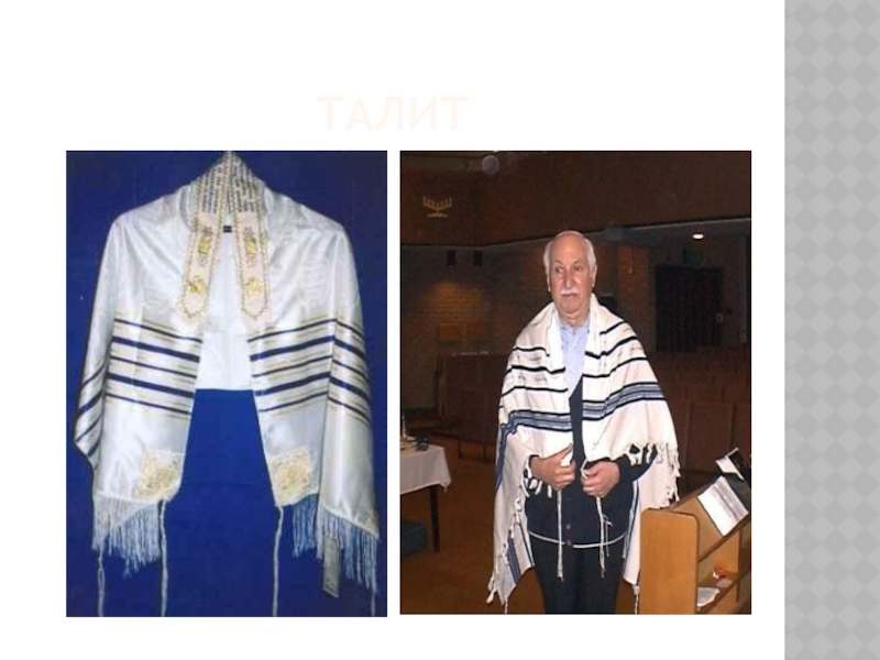 считался талит. Талит представлял собой прямоугольный кусок шерстяной ткани белого цвета с черными полосами по краям и кистями. Его надевали во время молитвы или в праздничные дни.