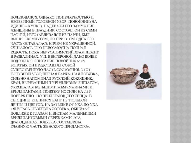 Слайд 12Пользовался, однако, популярностью и необычный головной убор- повойник (на идише –