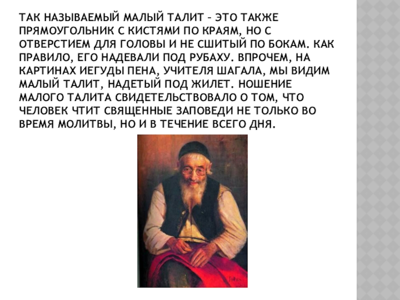 краям, но с отверстием для головы и не сшитый по бокам. Как правило, его надевали под рубаху. Впрочем, на картинах Иегуды Пена, учителя Шагала, мы видим малый талит, надетый под жилет. Ношение малого талита свидетельствовало о том, что человек чтит священные заповеди не только во время молитвы, но и в течение всего дня.