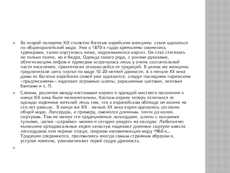 общеевропейской моде. Уже в 1870-х годах кринолины сменились турнюрами, талия опустилась ниже, видоизменился корсет. Он стал стягивать не только талию, но и бедра. Одежда такого рода, с узкими рукавами, обтягивающим лифом и турнюром встречалась лишь у очень состоятельной части населения, практически отказавшейся от традиций. В целом же женщины предпочитали шить платья по моде 10–20-летней давности. А в начале ХХ века дамы из богатых еврейских семей уже одеваются, следуя последним парижским «предписаниям»: надевают огромные шляпы, украшенные цветами, лентами бантами и т. П.