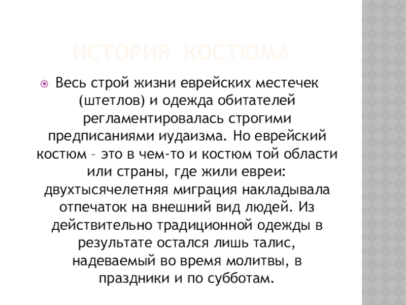 строгими предписаниями иудаизма. Но еврейский костюм – это в чем-то и костюм той области или страны, где жили евреи: двухтысячелетняя миграция накладывала отпечаток на внешний вид людей. Из действительно традиционной одежды в результате остался лишь талис, надеваемый во время молитвы, в праздники и по субботам.