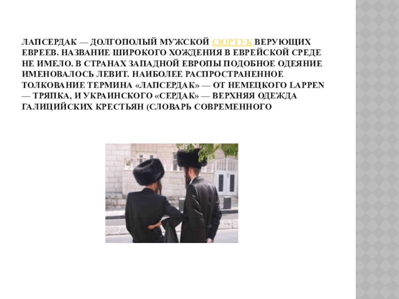 Слайд 13Лапсердак — долгополый мужской сюртук верующих евреев. Название широкого хождения в
