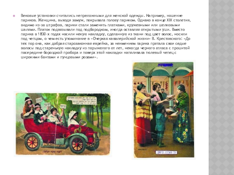 выходя замуж, покрывала голову париком. Однако в конце XIX столетия, видимо из-за штрафов, парики стали заменять платками, кружевными или шелковыми шалями. Платок подвязывали под подбородком, иногда оставляя открытыми уши. Вместо парика в 1830-х годах носили некую накладку, сделанную из ткани под цвет волос, носили под чепцом, о чем есть упоминание в «Очерках кавалерийской жизни» В. Крестовского: «До тех пор она, как добрая старозаконная еврейка, за неимением парика прятала свои седые волосы под старенькую накладку из порыжелого от лет, некогда черного атласа с прошитой посередине бороздкой пробора и поверх этой накладки напяливала тюлевый чепец с широкими бантами и пунцовыми розами».