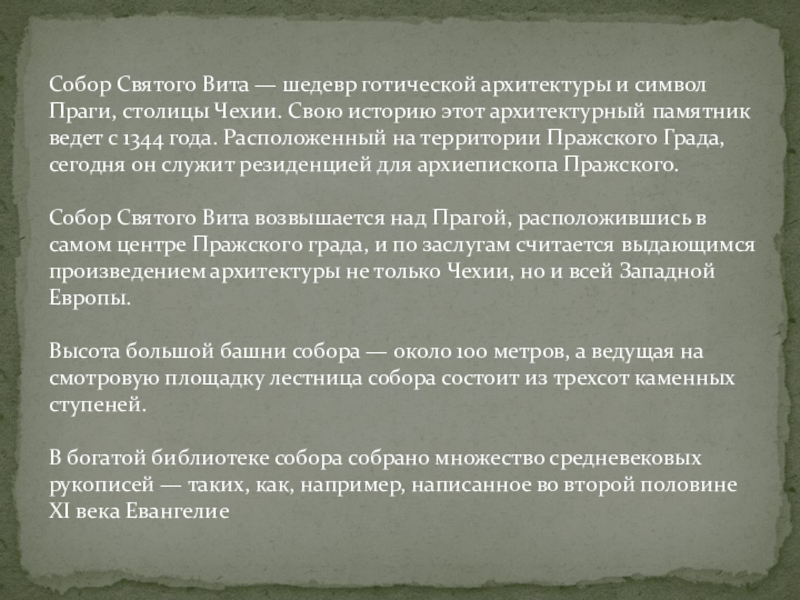 Слайд 4Собор Святого Вита — шедевр готической архитектуры и символ Праги, столицы