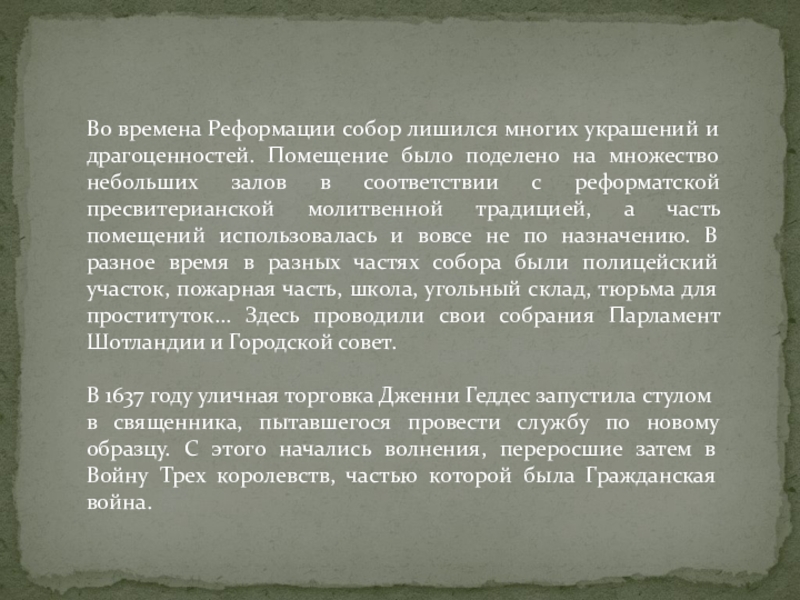 Слайд 9Во времена Реформации собор лишился многих украшений и драгоценностей. Помещение было