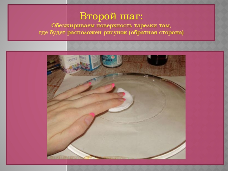 Второй шаг: Обезжириваем поверхность тарелки там, где будет расположен рисунок (обратная сторона)