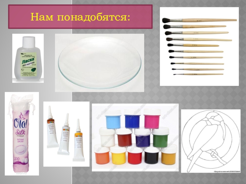 Нам понадобятся:Стеклянная тарелочкаОбезжиривающая поверхность жидкость: спирт, ацетонВата или ватные дискиКонтур для обводки рисункаТрафарет рисунка или картинкаАкриловые или
