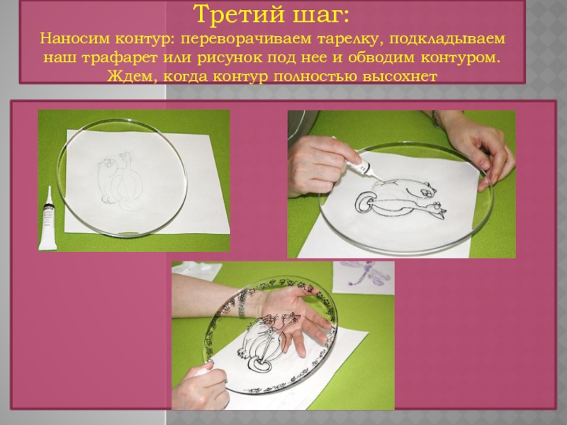 Третий шаг: Наносим контур: переворачиваем тарелку, подкладываем наш трафарет или рисунок под нее и обводим контуром. Ждем,