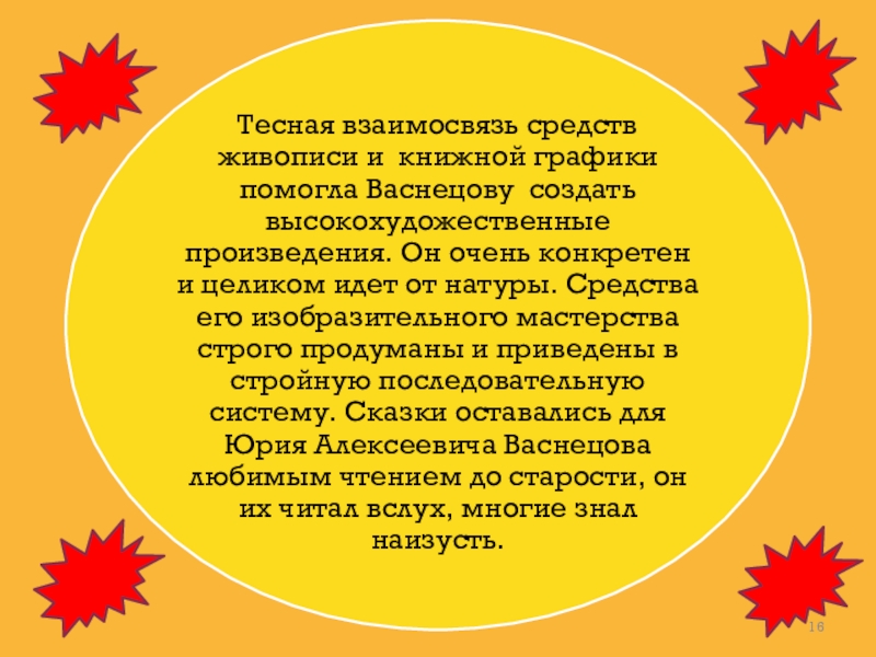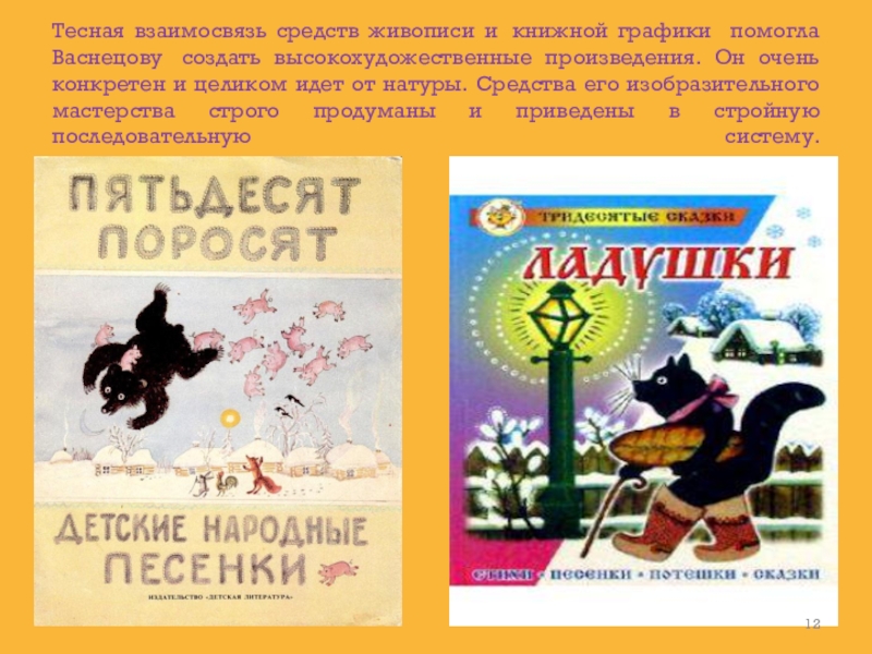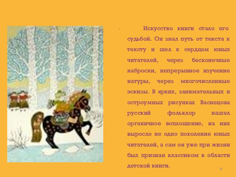 путь от текста к тексту и шел к сердцам юных читателей, через бесконечные наброски, непрерывное изучение натуры, через многочисленные эскизы. В ярких, занимательных и остроумных рисунках Васнецова русский фольклор нашел органичное воплощение, на них выросло не одно поколение юных читателей, а сам он уже при жизни был признан классиком в области детской книги.
