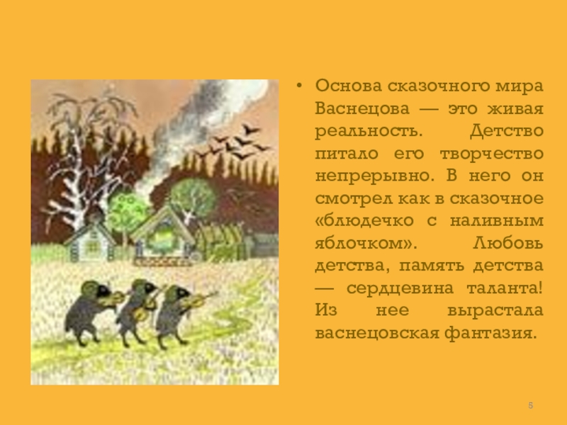 Слайд 5Основа сказочного мира Васнецова — это живая реальность. Детство питало его