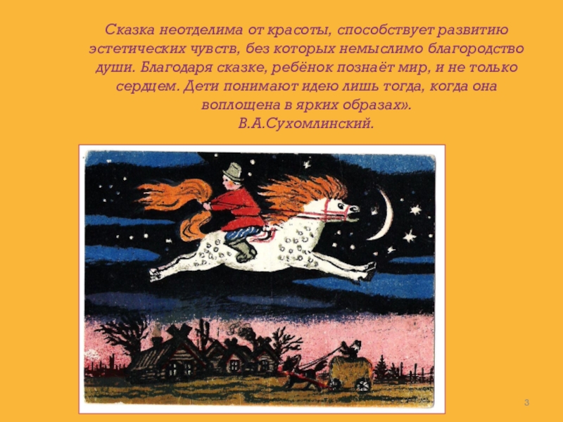 развитию эстетических чувств, без которых немыслимо благородство души. Благодаря сказке, ребёнок познаёт мир, и не только сердцем. Дети понимают идею лишь тогда, когда она воплощена в ярких образах».