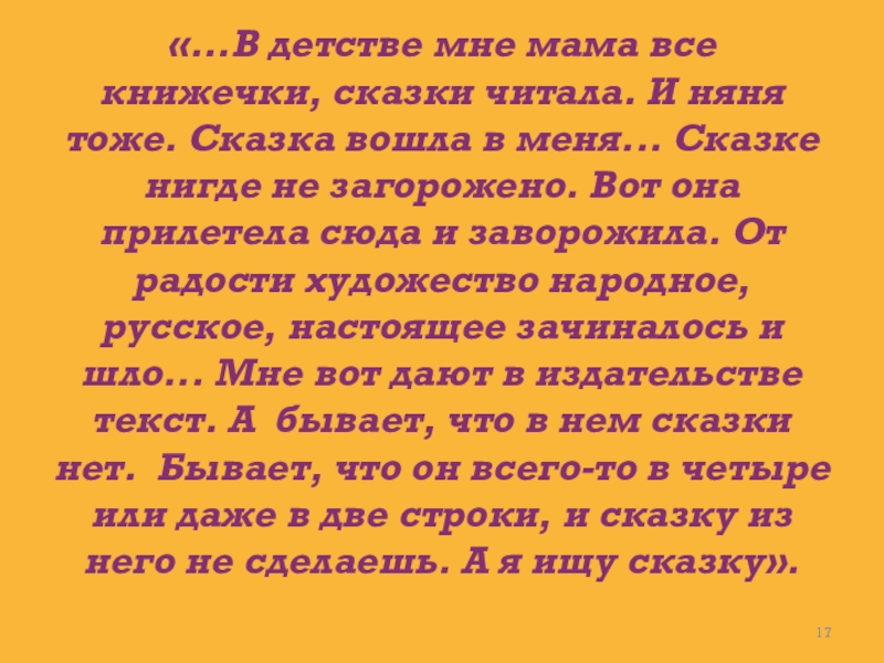 Слайд 17«...В детстве мне мама все книжечки, сказки читала. И няня тоже.